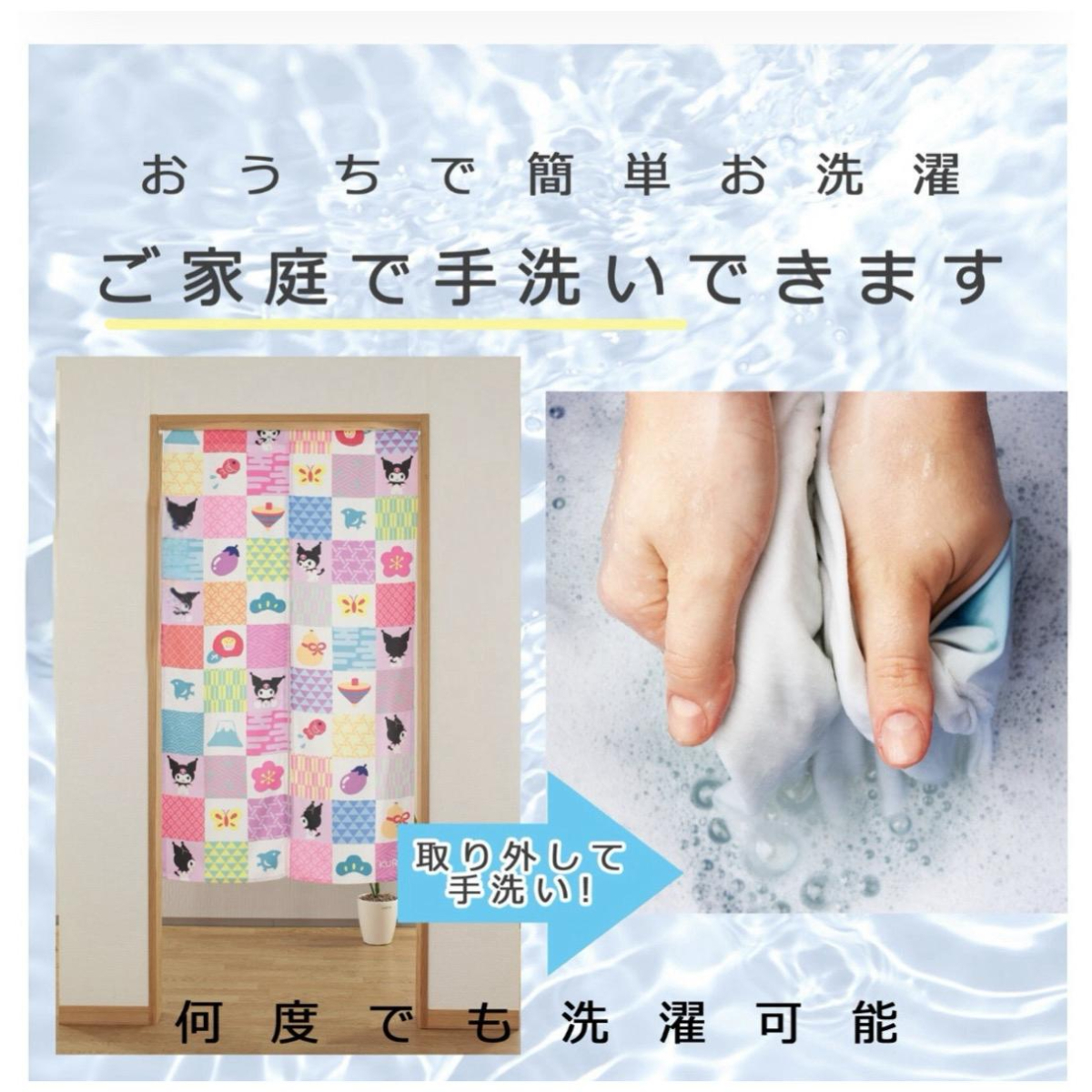 • 和風角色門簾輕輕垂落,圖案裏面有祭典、和服、神社守護犬、櫻花、達摩、富士山,亦有Hello Kitty、Kuromi、Cinnamoroll用佢哋最可愛嘅姿態陪住你。呢種門簾喺日本叫「のれん」,係介乎門同布之間嘅存在,唔需要完全阻隔,但又可以為生活留下一點空氣感