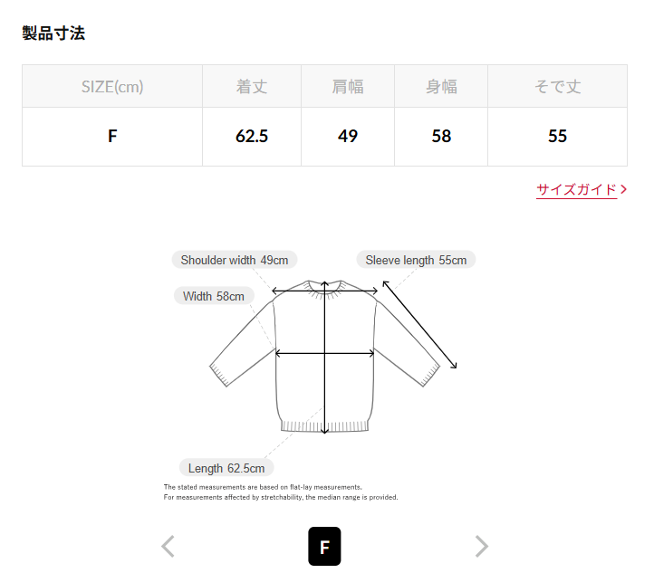 • 袖長:55 cm (21.7")