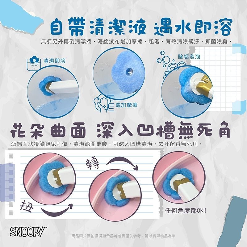 • 花朵曲面海綿:深入馬桶邊角位,凹槽位都刷到,真正無死角