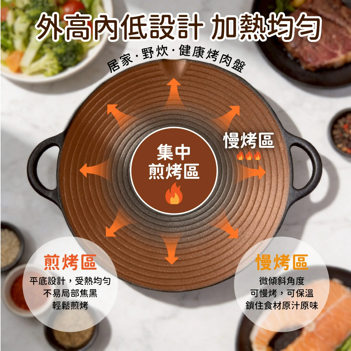 • 外高內低設計:中心集中煎烤區火力最強,周邊慢烤區可保溫,避免焦黑,煎烤更輕鬆。
