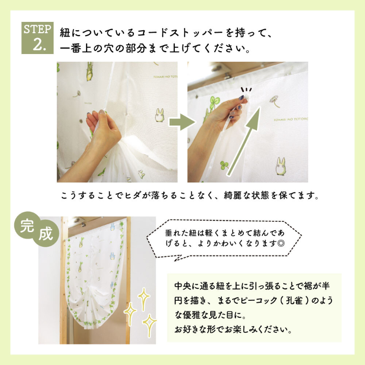 • 輕輕拉動中間的繩子,下擺會畫出半圓形,輕鬆拉至所需的高度或你喜歡的形狀
